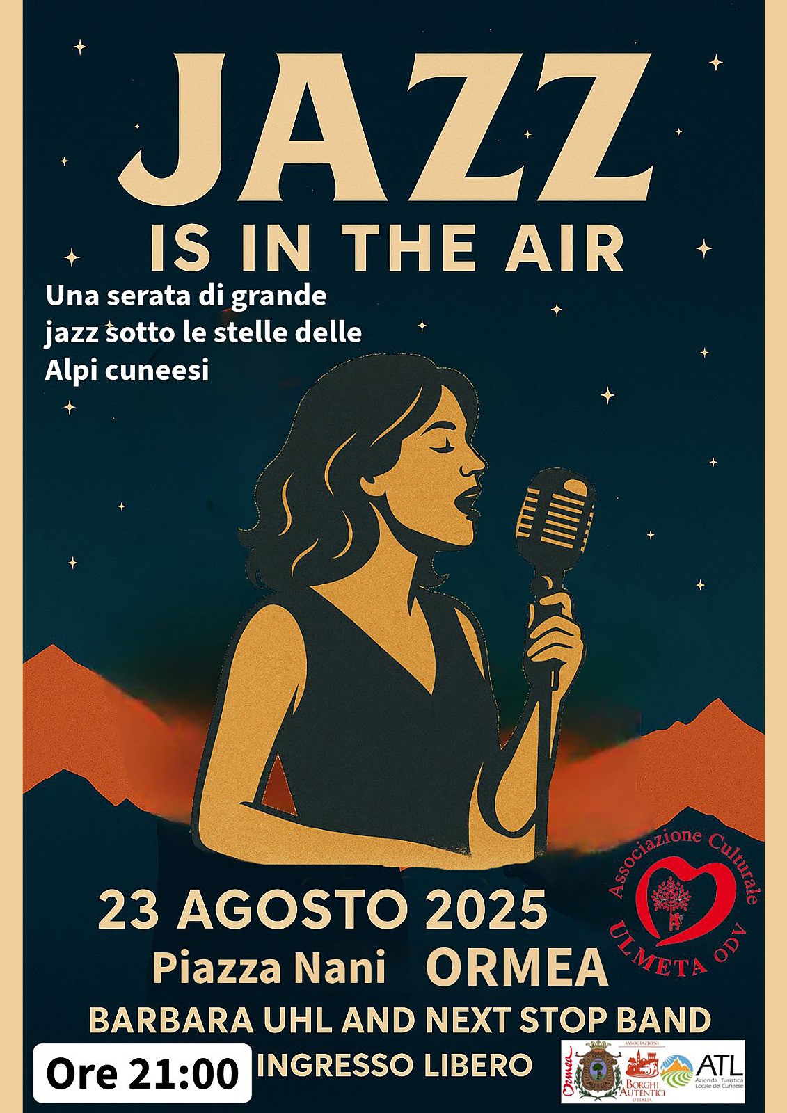 Venerdì 23 agosto 2025, alle ore 21:00 in Piazza Nani a Ormea, il concerto "Jazz is in the air" con Barbara Uhl and Next Stop Band.