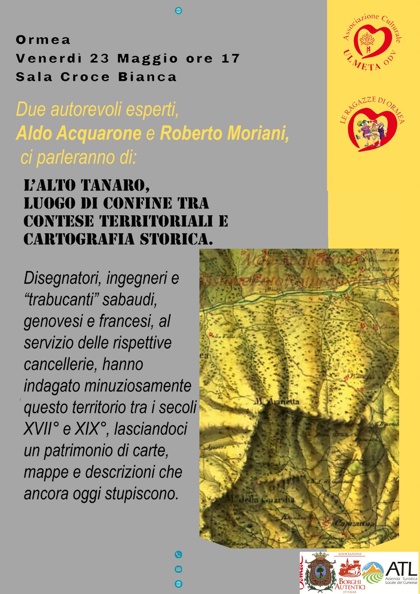 Venerdì 23 Maggio alle ore 17:00 nella Sala Croce Bianca di Ormea, due autorevoli esperti, Aldo Acquarone e Roberto Moriani, terranno un incontro dal titolo "L’Alto Tanaro, luogo di confine tra contese territoriali e cartografia storica".