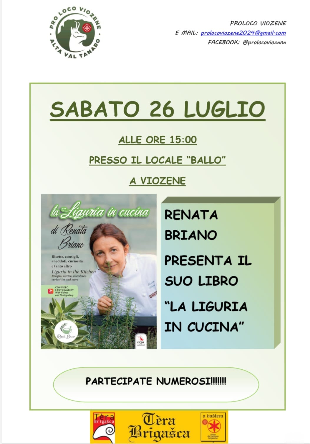 Sabato 26 luglio alle ore 15:00, presso l'area Ballo a Viozene, presentazione del libro "La Liguria in cucina" di Renata Briano.