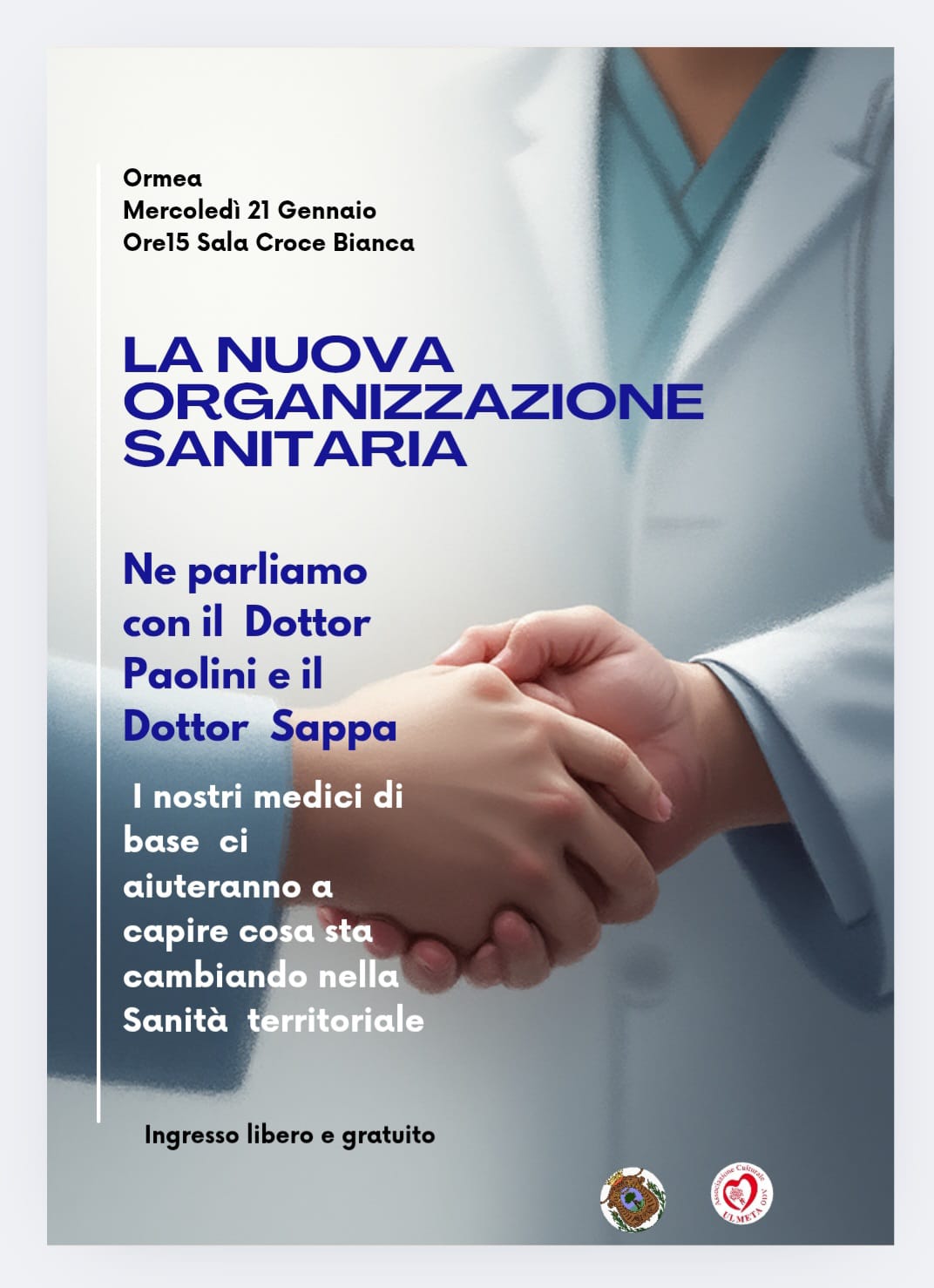 Mercoledì 21 gennaio, dalle ore 15 nella Sala della Croce Bianca, si svolgerà un incontro con il Dottor Paolini ed il Dottor Sappa per approfondire i cambiamenti della Sanità Territoriale.