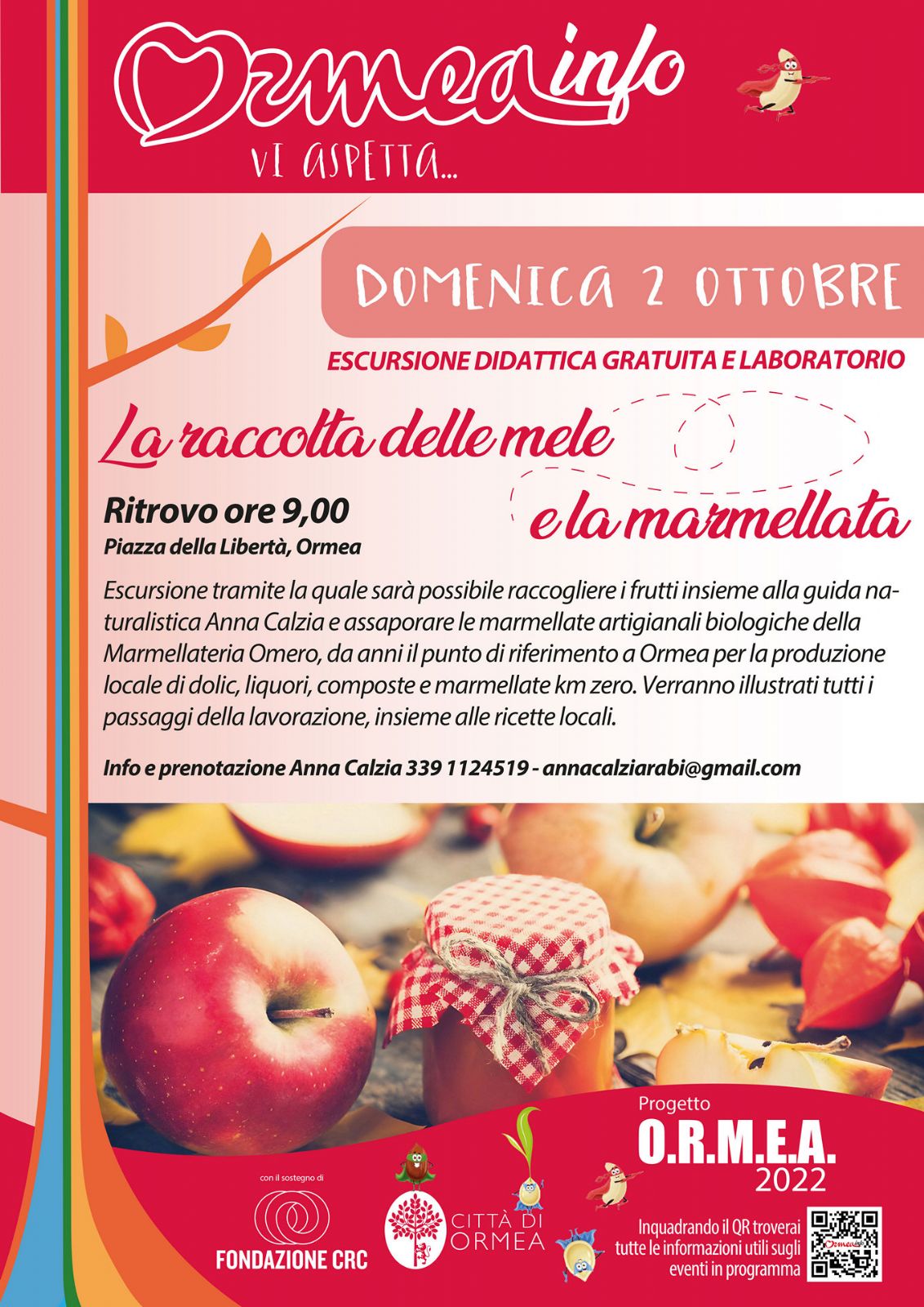 L'escursione guidata gratuita "La Raccolta delle Mele e la Marmellata", tramite la quale sarà possibile raccogliere i frutti insieme alla guida naturalistica Anna Calzia e assaporare le marmellate artigianali biologiche della Marmellateria Omero, da anni il punto di riferimento a Ormea per la produzione locale di dolci, liquori, composte e marmellate a km zero. Verranno illustrati tutti i passaggi della lavorazione, insieme alle ricette locali.