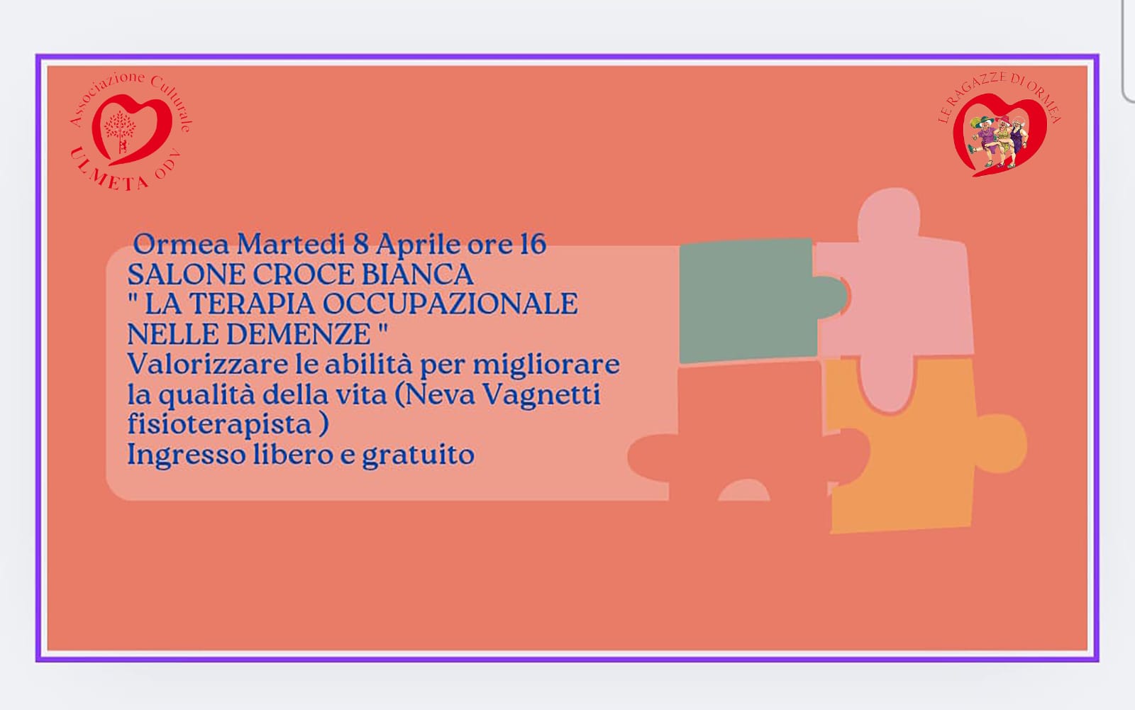 Martedì 8 aprile alle ore 16, presso il Salone Croce Bianca di Ormea, si terrà un incontro dedicato alla Terapia Occupazionale nelle Demenze, un'opportunità per approfondire questa disciplina riabilitativa che aiuta le persone con demenza a mantenere le proprie abilità e a svolgere le attività quotidiane, migliorando così la loro qualità di vita.