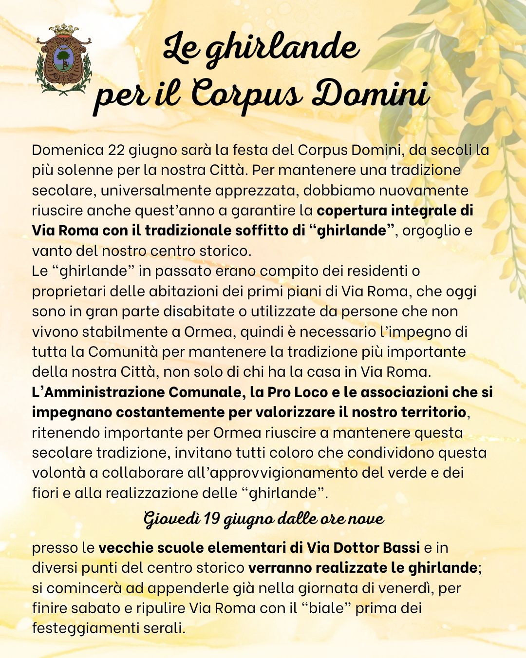 Domenica 22 giugno Ormea celebra la festa del Corpus Domini, la più solenne per la nostra Città. Come ogni anno, l’obiettivo è quello di coprire integralmente Via Roma con il tradizionale soffitto di “ghirlande”, simbolo di una tradizione secolare che rappresenta l’orgoglio del nostro centro storico.