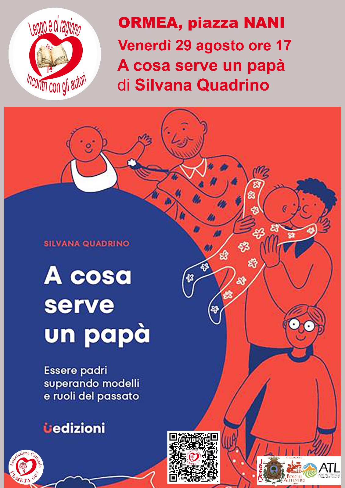 Venerdì 29 agosto alle ore 17.00 in piazza Nani, nell’ambito della rassegna “Leggo e ci ragiono – Incontri con gli autori”, Silvana Quadrino presenta il suo libro "A cosa serve un papà" (Uedizioni).
