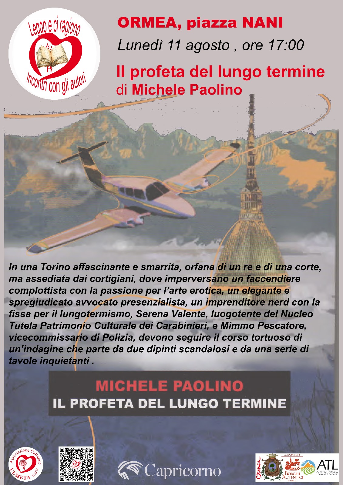 Lunedì 11 agosto alle ore 17:00, in Piazza Nani a Ormea, per la rassegna "Leggo e ci ragiono – Incontri con gli autori", Michele Paolino presenta il suo ultimo romanzo "Il profeta del lungo termine", un giallo avvincente ambientato in una Torino misteriosa e decadente, sospesa tra arte, scandali e complotti.