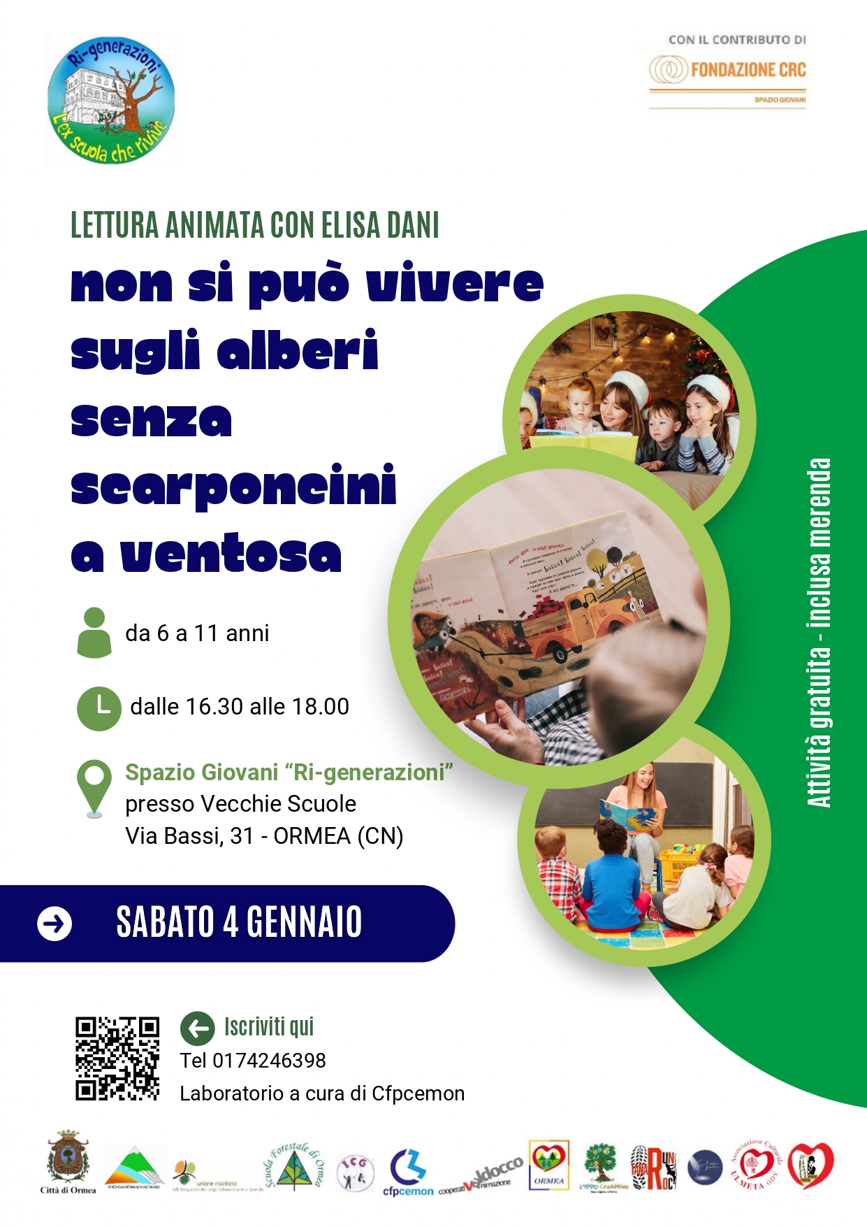 Presso lo Spazio Giovani “Ri-generazioni” nelle Vecchie Scuole in Via Bassi, 31 a Ormea dalle 16.30 alle 18.00 Lettura animata con Elisa Dani: "Non si può vivere sugli alberi senza scarponcini a ventosa"