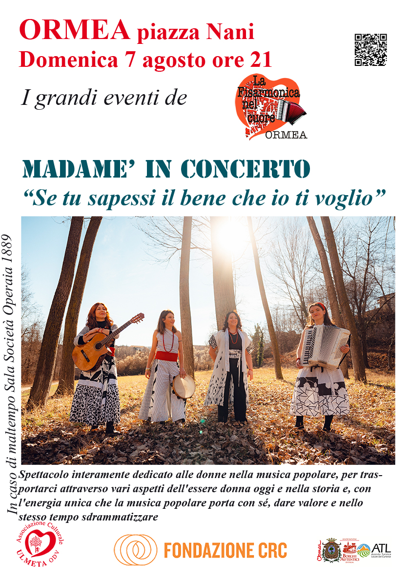 Le Madamè sono un gruppo musicale composto da 4 ragazze che cantano a 4 voci accompagnandosi con fisarmoniche, chitarra e percussioni. Il loro concerto propone allo spettatore un vero e proprio viaggio nella musica popolare italiana, per immergersi nelle proprie origini con autentica attualità, attraverso lo sguardo di donne di ieri e di oggi che si uniscono con la musica, il racconto, la dolcezza e l’energia. Il repertorio è tratto dalla cultura della musica popolare: mediante la ricerca e l'arrangiamento di brani selezionati, le Madamè riportano alla luce canzoni tradizionali di fine 800 - inizio 900, canti di lavoro, di femmine e di briganti, brani d'amore, di speranza e di partecipazione. Nel viaggio s’incontrano brani emozionanti, lenti e introspettivi, ma anche brani che scatenano l'energia dei ritmi di balli e danze popolari.