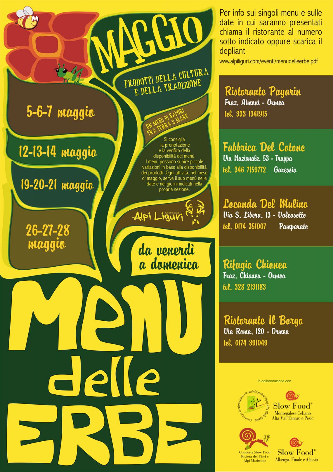 Ristoranti e rifugi per gustare ed assaporare la tradizione di questo territorio unico che proprio durante tutto il mese di maggio offre scenari naturali e fioriture di erbe spontanee di estrema bellezza, in un ambiente montano ed alpino, ma con aperture stagionali miti già sfruttabili appieno per escursioni, trekking ed attività outdoor vissute con largo anticipo, grazie all'esposizione della Val Tanaro e alla sua vicinanza alla Riviera Ligure di ponente.