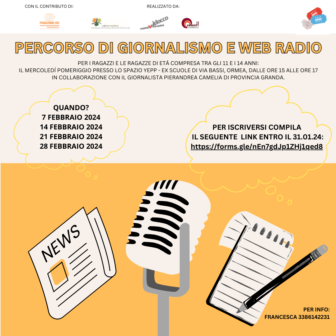 Il mercoledì pomeriggio, per i ragazzi e le ragazze di età compresa tra gli 11 e i 14 anni, presso lo spazio Yepp in Via Bassi a Ormea, dalle ore 15 alle ore 17 in collaborazione con il giornalista Pierandrea Camelia di Provincia Granda si svolgerà un corso di giornalismo e web radio.