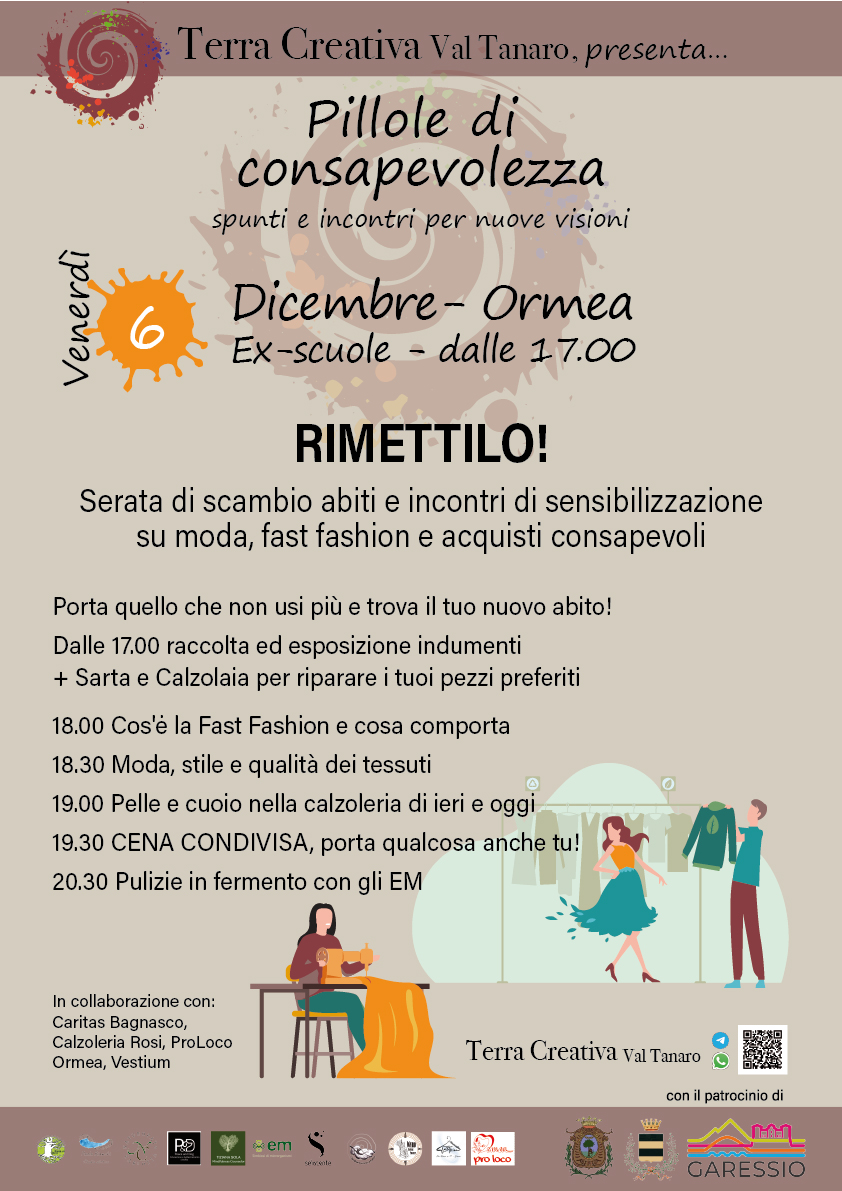 | Organizzazione | Terra Creativa in collaborazione con Caritas Bagnasco, Calzoleria Rosi, ProLoco Ormea, Vestium. |