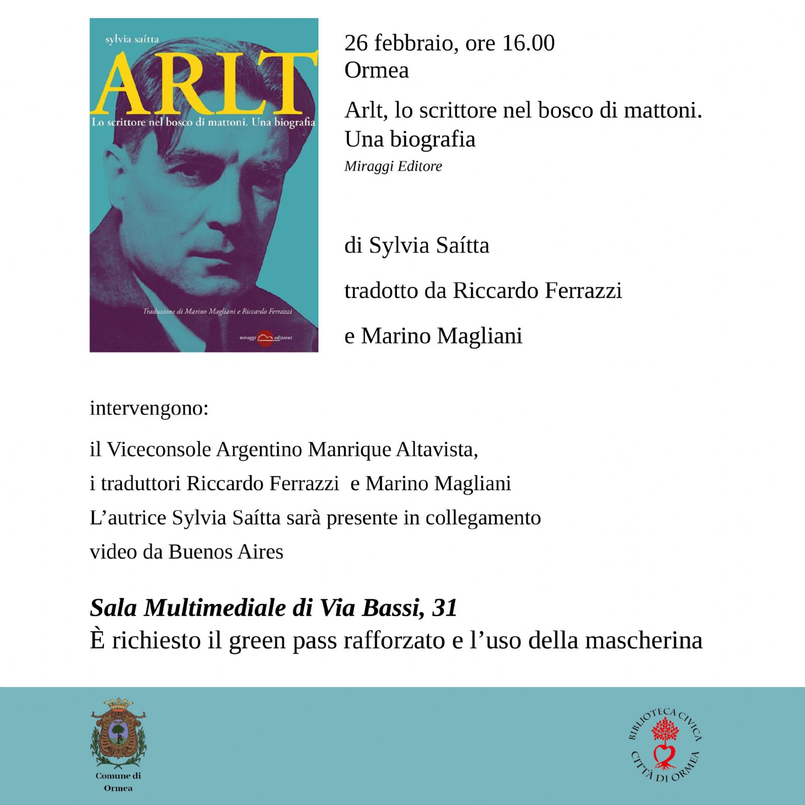𝐒𝐚𝐛𝐚𝐭𝐨 𝟐𝟔 𝐟𝐞𝐛𝐛𝐫𝐚𝐢𝐨 𝟐𝟎𝟐𝟐, 𝐚𝐥𝐥𝐞 𝐨𝐫𝐞 𝟏𝟔.𝟎𝟎, 𝐧𝐞𝐥𝐥𝐚 𝐬𝐚𝐥𝐚 𝐦𝐮𝐥𝐭𝐢𝐦𝐞𝐝𝐢𝐚𝐥𝐞 𝐝𝐞𝐥𝐥𝐞 𝐯𝐞𝐜𝐜𝐡𝐢𝐞 𝐬𝐜𝐮𝐨𝐥𝐞 𝐝𝐢 𝐕𝐢𝐚 𝐃𝐨𝐭𝐭𝐨𝐫 𝐁𝐚𝐬𝐬𝐢, l'Amministrazione Comunale e la Biblioteca Civica di Ormea, organizzano l'anteprima della presentazione nazionale del libro "Arlt, lo scrittore nel bosco di mattoni. Una biografia" che verrà poi presentato al Salone del Libro di Torino.