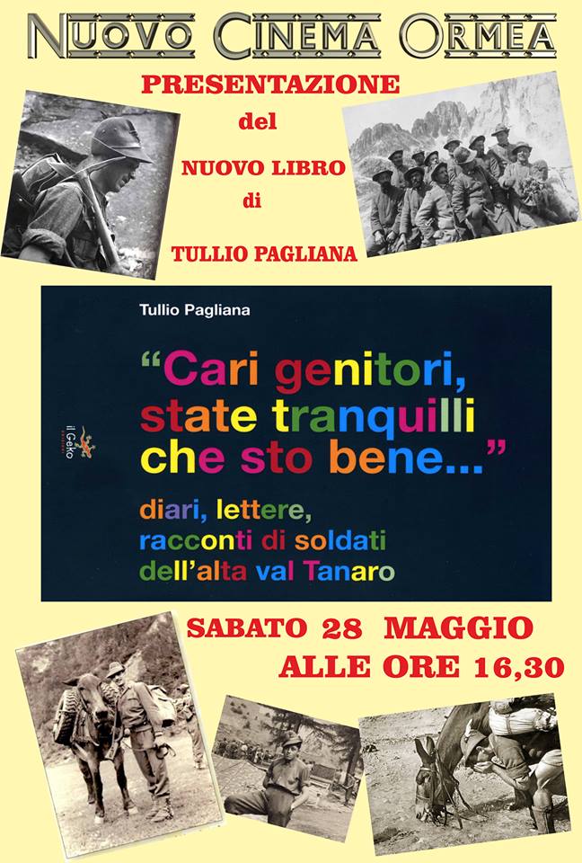 Sabato 28 maggio, in concomitanza con i festeggiamenti del Corpus Domini ad Ormea, lo scrittore Tullio Pagliana il suo nuovo lavoro letterario dal titolo “Cari genitori, state tranquilli che sto bene…” - diari, lettere, racconti di soldati dell’alta val Tanaro.