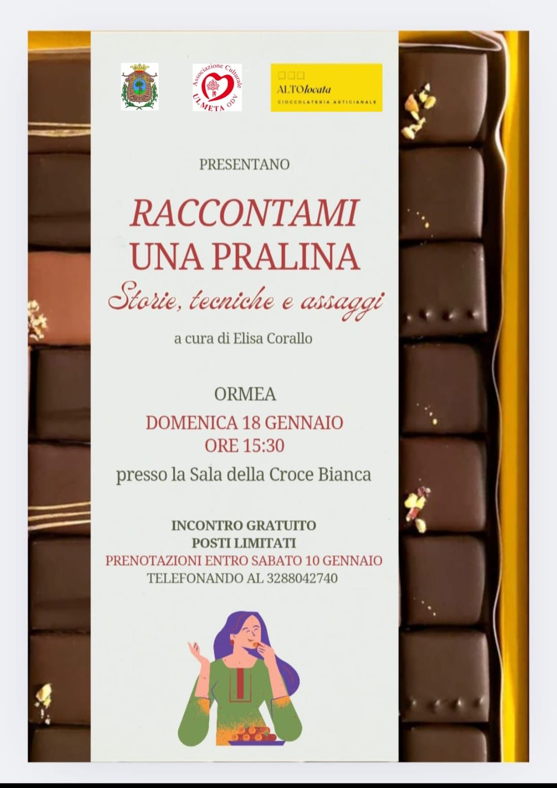 Protagoniste dell'incontro saranno le deliziose praline al cioccolato di sua produzione, nell'occasione di domenica 18 gennaio ne verranno raccontate le tecniche, la storia e proposti assaggi.