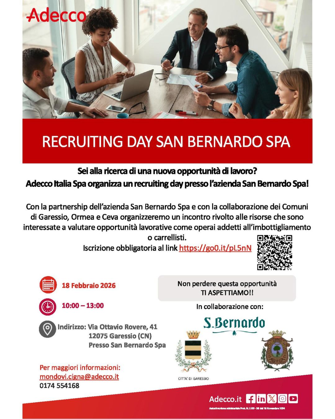 Adecco Italia Spa, in collaborazione con l’azienda San Bernardo Spa e con il supporto dei Comuni di Garessio, Ormea e Ceva, organizza un recruiting day dedicato a chi è alla ricerca di nuove opportunità professionali nel settore produttivo.