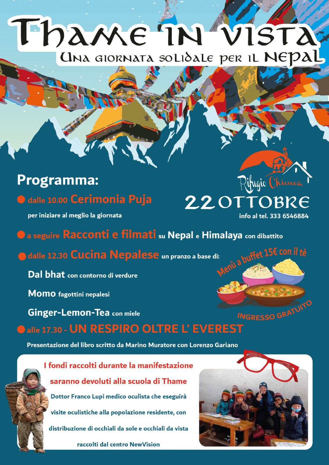 I fondi raccolti durante la manifestazione saranno devoluti alla scuola di Thame. Il dottor Franco Lupi, medico oculista che eseguirà visite oculistiche alla popolazione residente, con distribuzione di occhiali da sole e occhiali da vista raccolti dal centro NewVision.