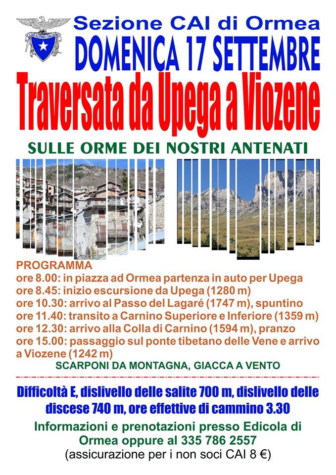 PROGRAMMA ore 8.00: in piazza ad Ormea partenza in auto per Upega ore 8.45: inizio escursione da Upega (1280 m) ore 10.30: arrivo al Passo del Lagaré (1747 m), spuntino ore 11.40: transito a Carnino Superiore e Inferiore (1359 m) ore 12.30: arrivo alla Colla di Carnino (1594 m), pranzo ore 15.00: passaggio sul ponte tibetano delle Vene e arrivo a Viozene (1242 m)