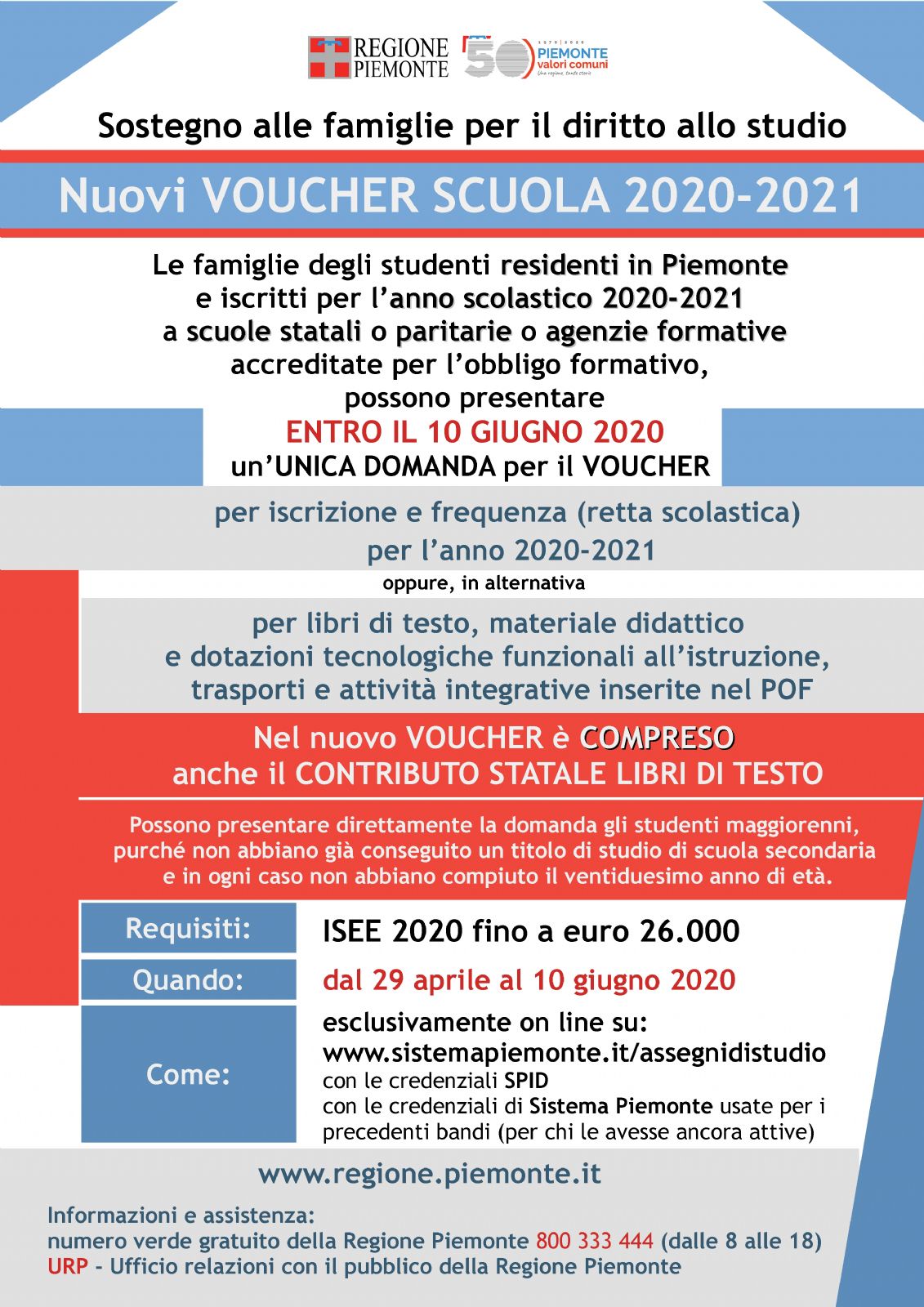Le famiglie degli studenti, residenti in Piemonte e iscritti per l’anno scolastico 2020-2021, a scuole statali o paritarie o agenzie formative accreditate per l’obbligo formativo, possono chiedere ENTRO IL 10 GIUGNO 2020