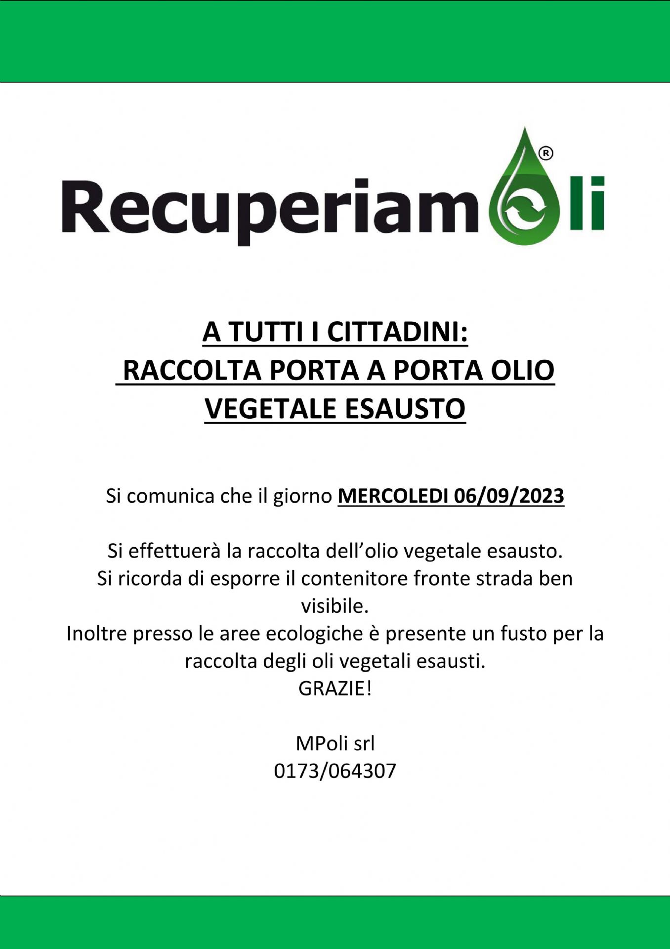 Si comunica che il giorno MERCOLEDI 06/09/2023 si effettuerà la raccolta dell'olio vegetale esausto.