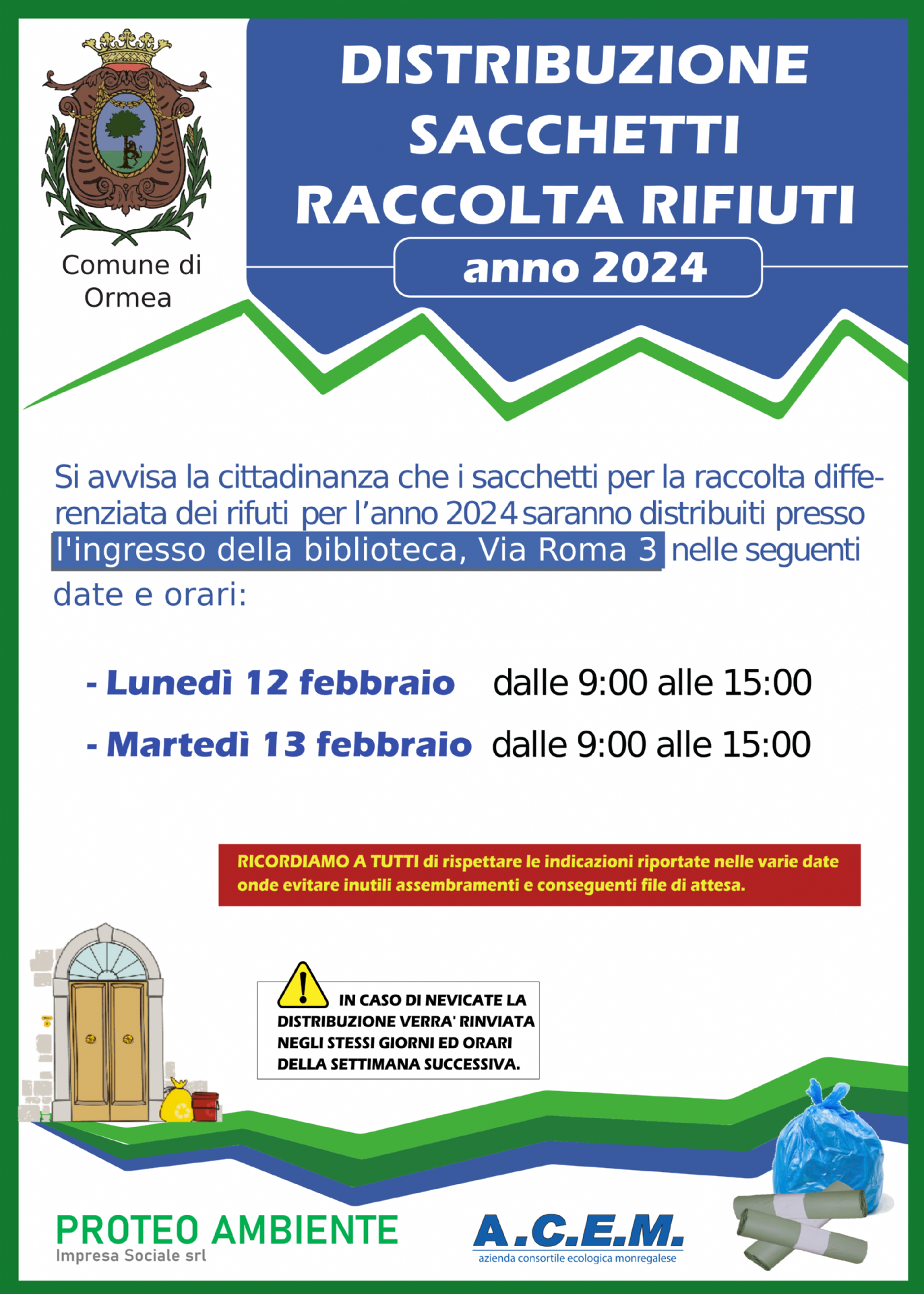 Si avvisa la cittadinanza che i sacchetti per la raccolta differenziata dei rifiuti per l'anno 2024 saranno distribuiti presso l'ingresso della Biblioteca, Via Roma 3, nelle seguenti date: