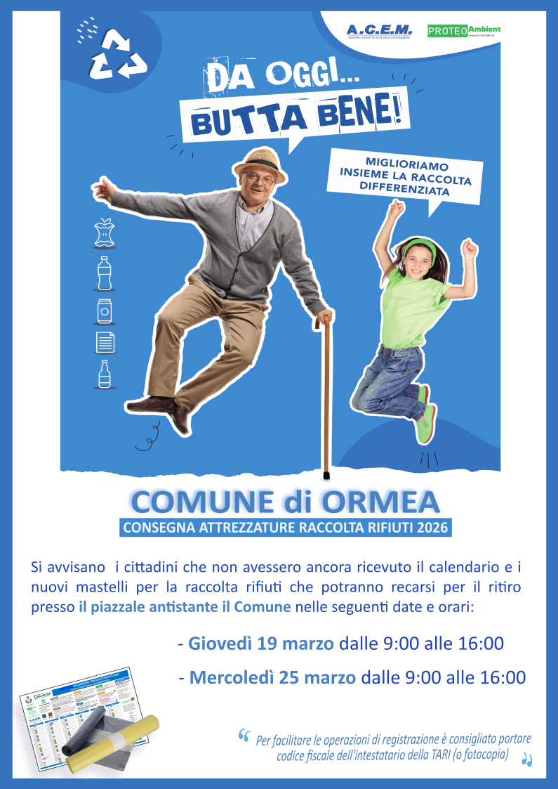 Come da comunicazioni di Proteo, si rende noto che nelle giornate del 19 e 25 marzo 2026, dalle ore 9.00 alle ore 16.00, presso la sede municipale in Via Teco n. 1, saranno presenti addetti della medesima ditta, incaricati della distribuzione dei kit di sacchetti e degli opuscoli informativi relativi all'attivazione del nuovo servizio di raccolta.